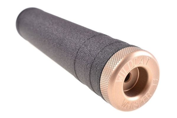 The Wildcat Whisper is an Over Barrel Design Moderator made from Coated Alloy and Stainless Steel fitted with a 1/2 inch UNF Thread.