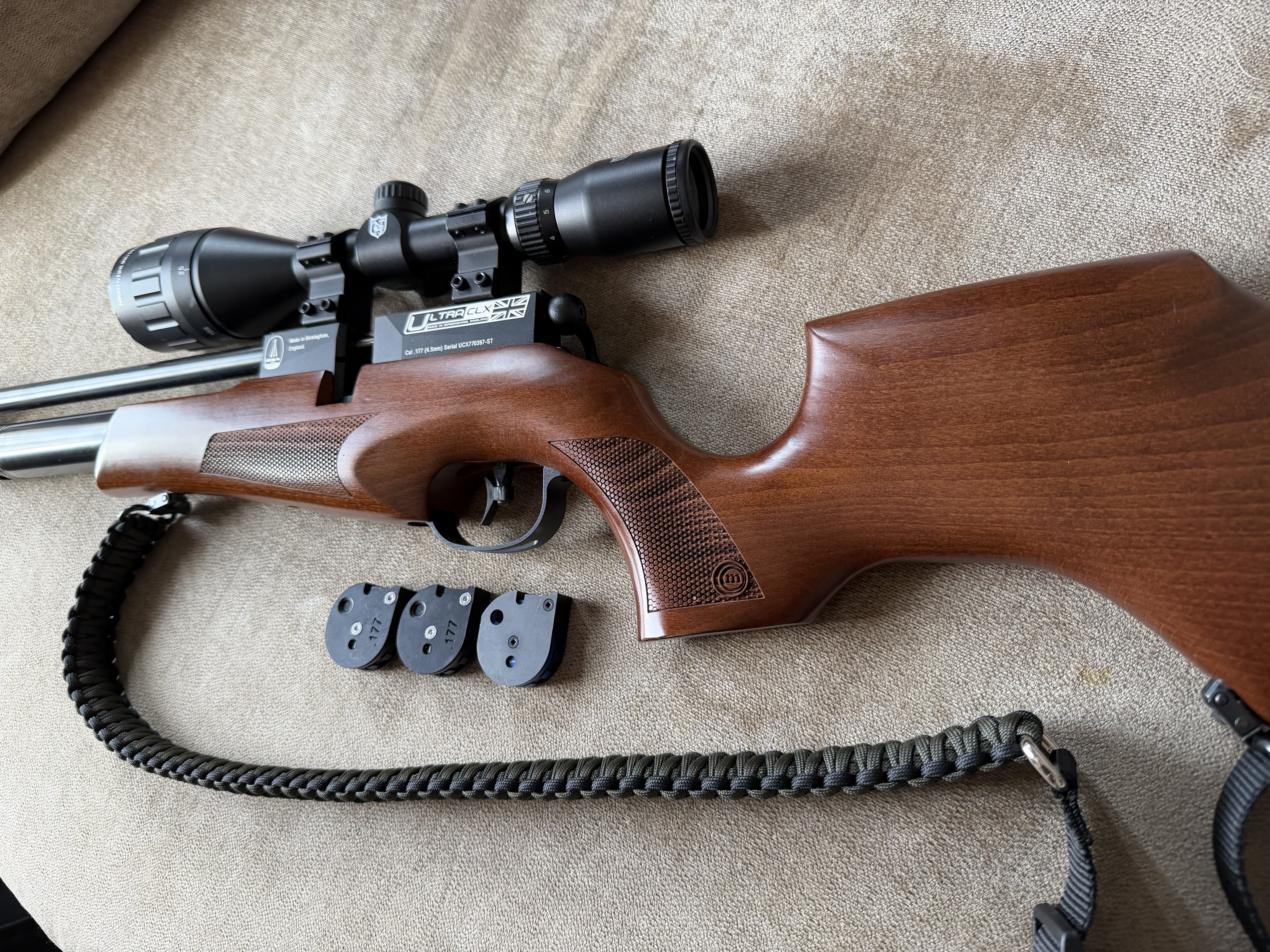 Great rifle with no faults, scope, sling and 3 12 shot magazines included